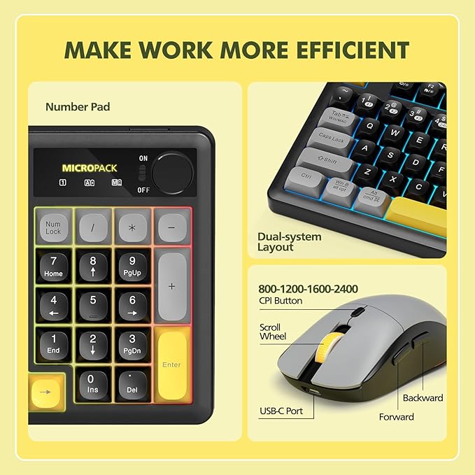 - 【Creamy Keyboard with Number Pad】Mac and Windows two-system layout, thocky keyboard with number pad and knob, ideal for both work and entertainment. The mouse supports 800/1200/1600/2400 DPI for precise control.