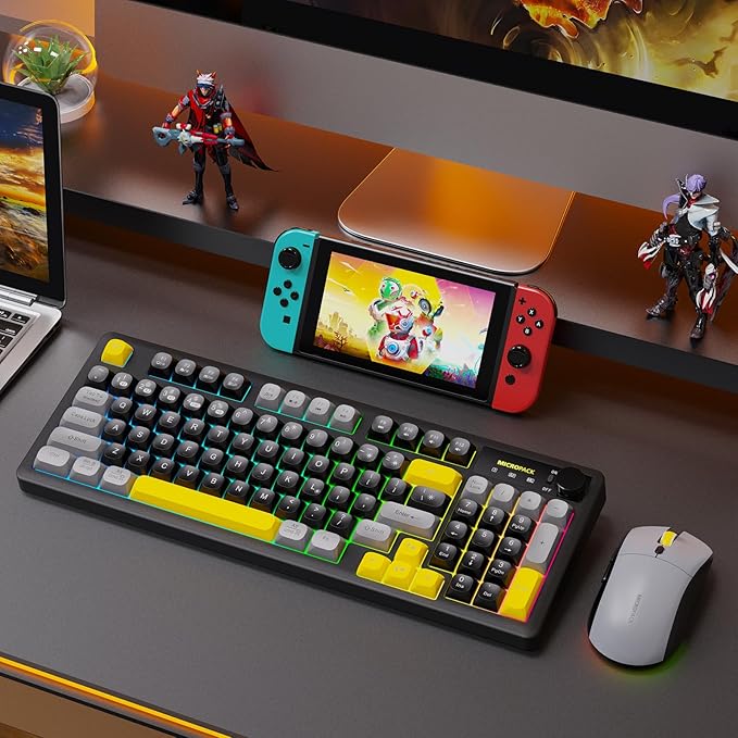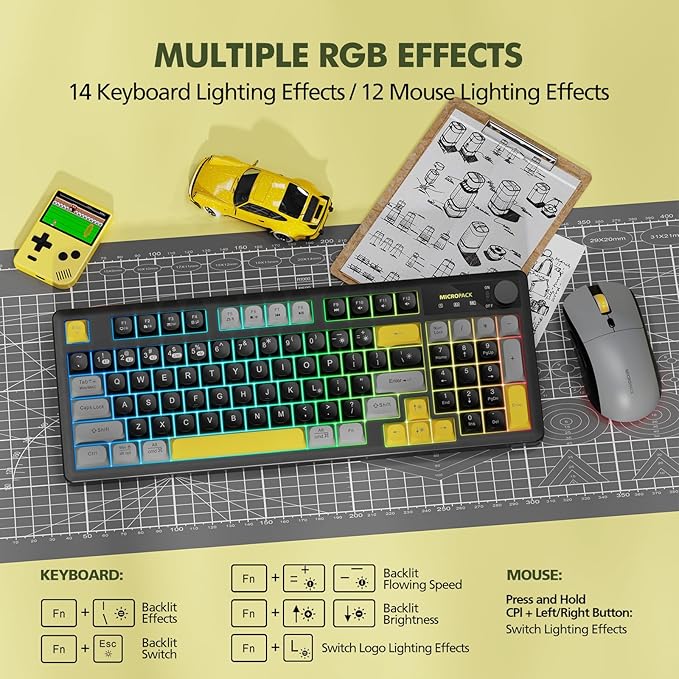 - 【Light Up Computer Keyboard & Mouse Combo】The wireless keyboard features 14 RGB lighting effects and the mouse offers 12, brightness and lighting speed can be adjusted directly on the device. Adding vibrant style to your workspace or gaming setup.