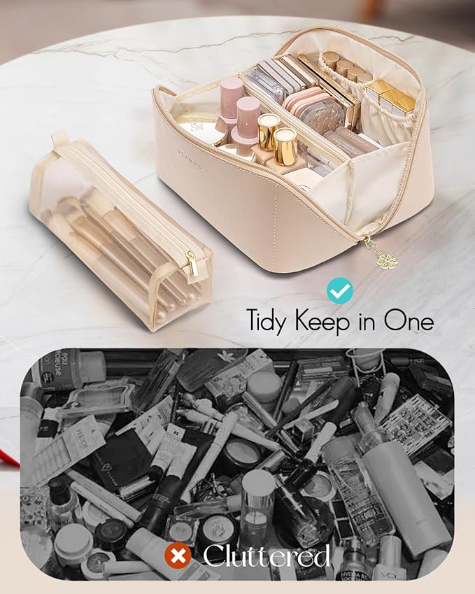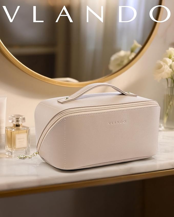 Vlando Makeup Bag,Large Capacity Travel Toiletry Bag,Cosmetic Bags for Women PU Leather Waterproof Portable Pouch with Divider & Handle-Toffee