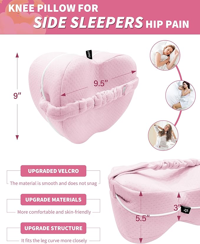 - [ORTHOPEDIC ALIGNMENT & RELIEF] A knee pillow for side sleepers that serves as a pillow for between legs while sleeping to keep hips, knees, and spine aligned—helping ease sciatica and lower-back pressure for deeper, calmer rest.