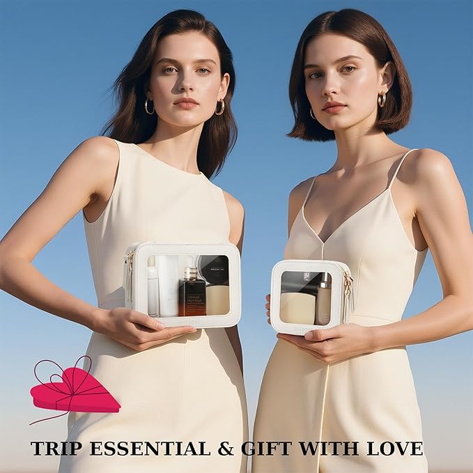 MSTONAL Clear Makeup Bag, Travel Toiletry Bag Cosmetic Case for Women, Waterproof Portable Make Up Skincare Pouch with Zipper, Compact Car Organizer Bag for Essentials, Mini & Medium, Ivory White