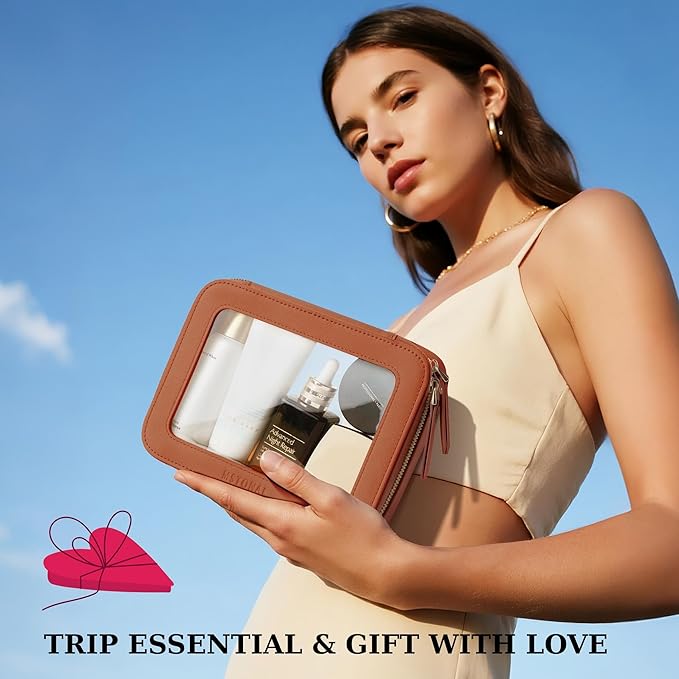 MSTONAL Clear Makeup Bag, Travel Toiletry Bag Cosmetic Case for Women, Waterproof Portable Make Up Skincare Pouch with Zipper, Compact Car Organizer Bag for Essentials, Medium Size, Brown