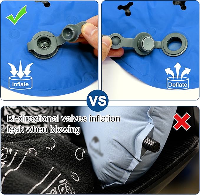- Specially Designed Portable Cushions: Our cushions are designed with special materials: 40D nylon on the front and 70D nylon on the back, so the material on the back of the cushion is stronger and more tear-resistant, so the shape of the cushion will be a little twisted after inflation, but this does not affect the effect of the use of the cushion, but rather it is a strong evidence that the cushion is better quality.