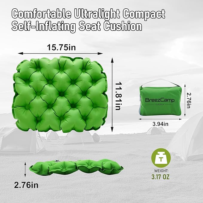 BreezCamp Inflatable Seat Cushion, Lightweight Stadium Seat Pad, Camping Accessories Chair Pad for Airplane Travel, Hiking, Climbing, Home and Office,Green