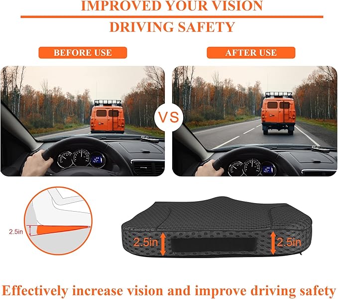 - Expand Driving Vision - The height of the driving position is increased by 2.5 inches, and apparently by using our car seat cushions for driving could expand the vision and help the driver see more clearly. The car seat cushions for short people could also promote right posture and correct spinal alignment for a good driving. We also add a non-slip bottom to keep the car seat pad in place