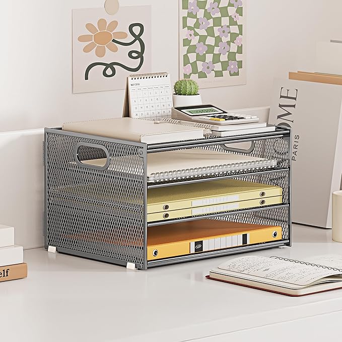 - Paper Organizer Function and Usage: The mesh desktop file organizer can hold various items including paper, folders, books, bills, notebooks, etc. The open design enables quick identification and access to contents, helping to declutter and organize the desk