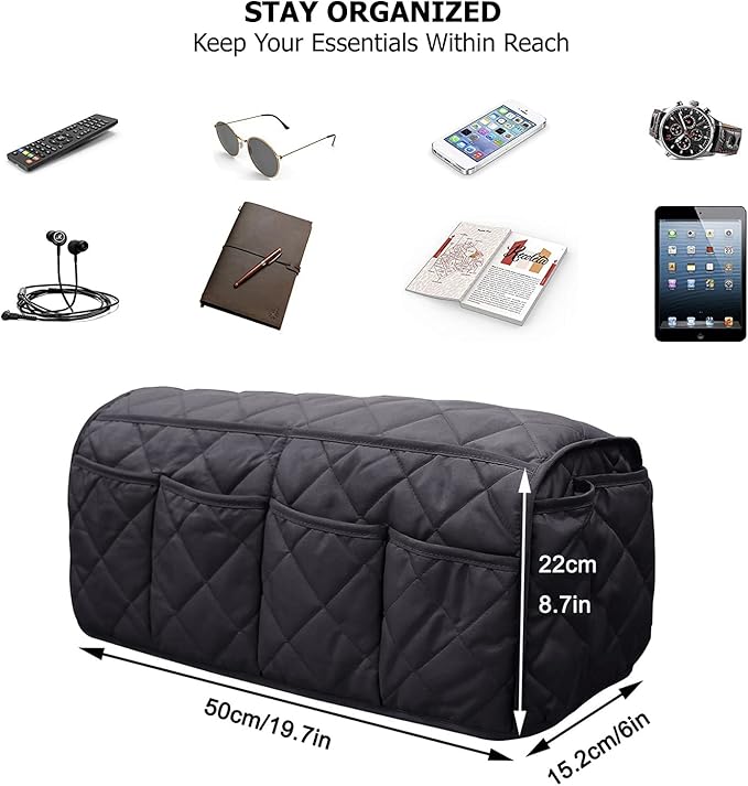 - 【Chair Arm Covers with 14 Pockets】-The sofa armrest storage bag has 14 pockets of different sizes. You can quickly and easily put the things you need. This armrest remote control holder can neatly stores your Phone, magazines, tv remote control,map and so on. The product may slipp off the leather couch; it might have been more effective on a fabric couch!