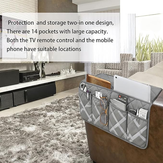- 【Chair Arm Covers with 14 Pockets】-The sofa armrest storage bag has 14 pockets of different sizes. You can quickly and easily put the things you need. This armrest remote control holder can neatly stores your Phone, magazines, tv remote control,map and so on. The product may slipp off the leather couch; it might have been more effective on a fabric couch!