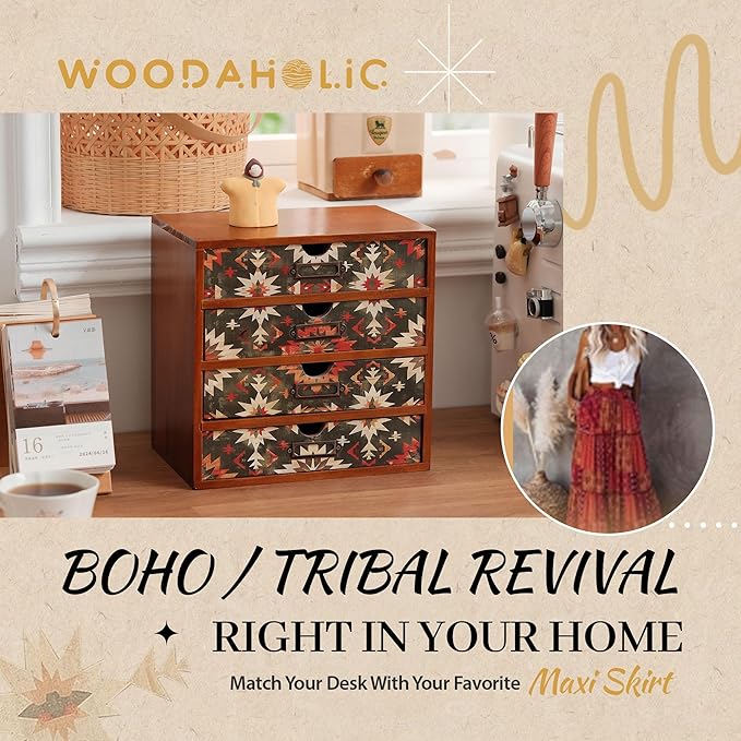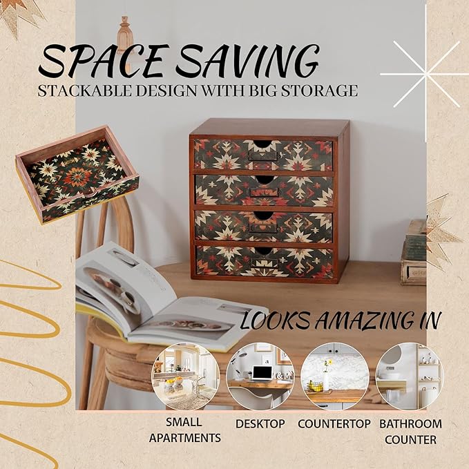 - Green boho charm for your space: This wooden desk organizer with drawers features an earthy green Navajo-inspired pattern, blending rustic and tribal design with calming bohemian style — perfect for desks, vanities, or shelves.