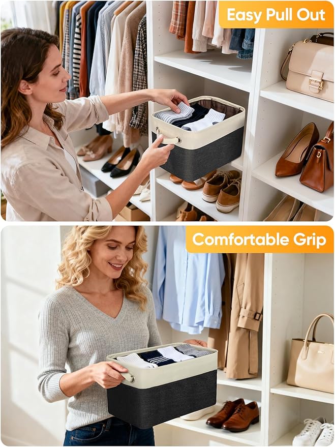 - [CONVENIENT HANDLES] Our closet storage bins come with two sturdy handles on each side that make it easy to carry and transport items from one room to another. These handles are also designed to provide a comfortable grip, ensuring that you can easily move your storage baskets for organizing around without any strain on your hands