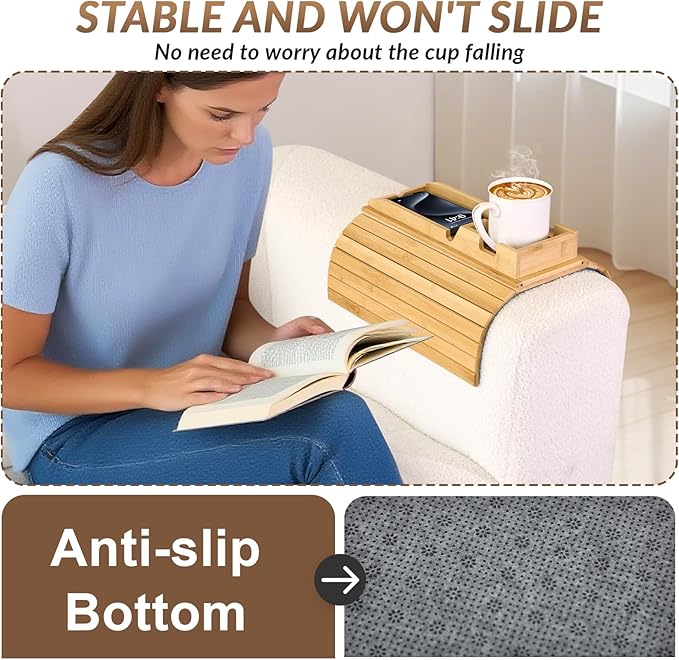 - ANTI-SLIP DESIGN: This armrest tray table for couch can accommodate different drinkware-coffee cups, glasses, soda cans or cocktail glasses. It also comes with three teacup handle grooves in different directions for easy placement of tea cups. It has an anti-slip design and an anti-slip pad on the back. It can be firmly fixed to the sofa armrest without sliding, no need to worry about the drink spilling on the sofa.