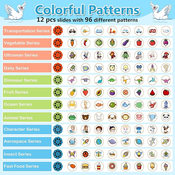 - 【Swan Drawing Projector for Kids】The MFEESYOB Smart Art Projector offers unique projection features to spark creativity. This complete set includes: 1 drawing projector, 1 sketchbook, 12 colored pens, and 12 discs (featuring 96 different image patterns). It’s an ideal drawing toy for early art education, providing children with foundational painting concepts in a fun and engaging way.