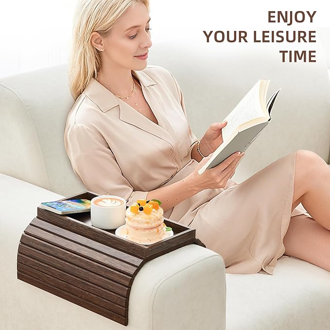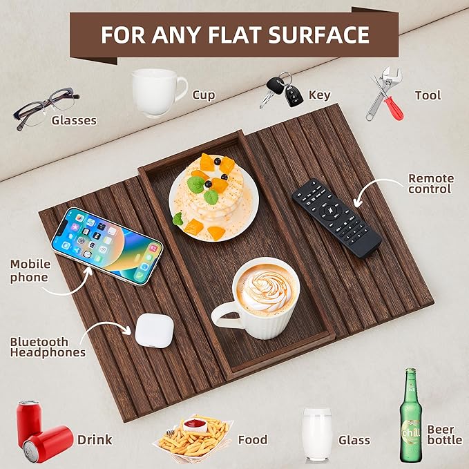 - DETAIL DESIGN: The spacious tray holds all your essentials, while raised edges effectively prevent drink spills and item drops; The foldable design offers easy portability and storage. This couch armrest tray is a space-saving alternative to large coffee tables and side tables