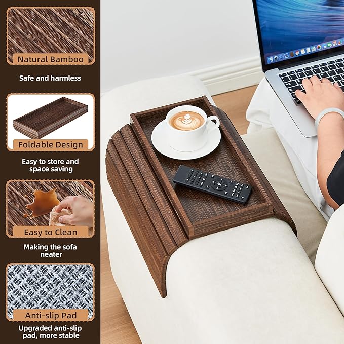Couch Arm Tray, Anti-Falling Bamboo Sofa Armrest Tray Table, Foldable & Portable Armrest Cup Holder Side Table for Drinks, Coffee, Phone, Snacks, Remote