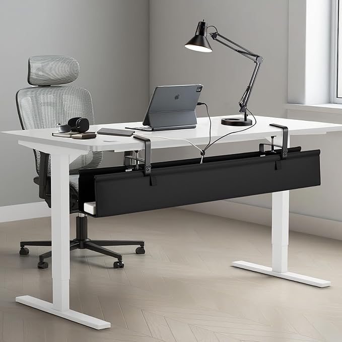 - 【Two Ways for Easy Installation】The Fabric Standing Desk Cable Management can be easily install with no drill clamp mounting or screw fixing installation. It is suitable for all types of tabletop materials, including wooden tables, glass tables, and metal tables.