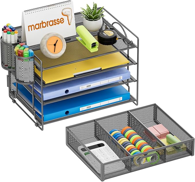 Marbrasse Desk Organizer and Accessories4-Tier Paper File Letter Tray Accessories & Workspace Desk Organizers with Drawer and 2 Pen Holders for School Home Office Supplies (Grey)