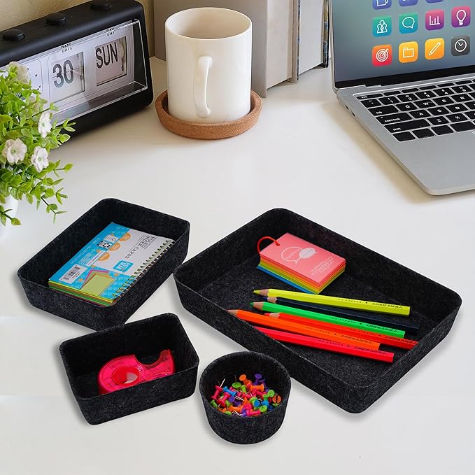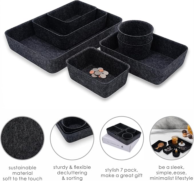 Welaxy Drawer organizer felt trays desk storage bins for home office supplies decluttering 7-piece (Carbon)