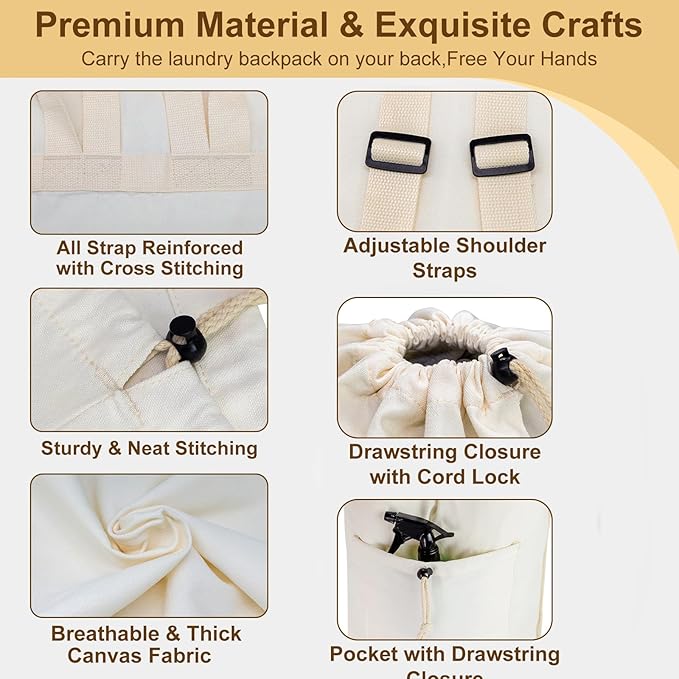 - Heavy Duty Laundry Bag- Made of heavy-duty canvas fabric, this premium canvas laundry bag is strong and sturdy. Reinforced stitching on each joint ensures longer lifespan and sturdy use. An essential laundry backpack for college