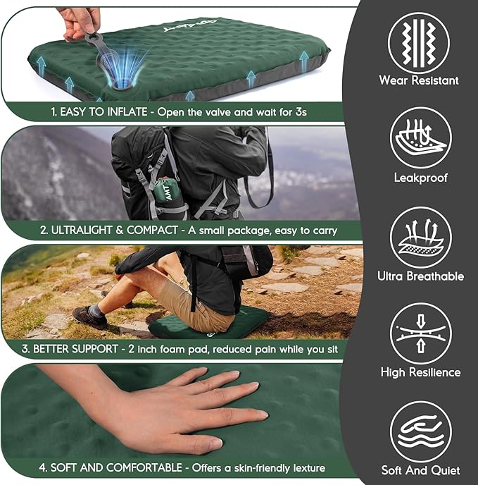 - MULTIFUNCTIONAL TRAVEL SEAT CUSHION - Built for the outdoor activities, the inflatable seat cushion made of durable material, dirt-resistant and non-slip bottom ensures stability and ultimate comfort on wet grass, rock, bleachers, sand, and more. Ideal for camping, travel, hiking, airplanes, picnics, concerts, the beach, fishing, watching sports, car or even office chairs, or any hard seating surface, ensuring you enjoy a superior seating experience.