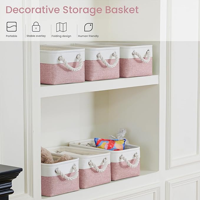 VQRTEXA Storage Baskets for Shelves 11.8x7.9x5.2 Inch, Foldable Fabric Storage Bins with Handles, Small Storage Baskets for Organizing Closet, Bathroom, Office, Home Organization (1-Pack, White&Pink)