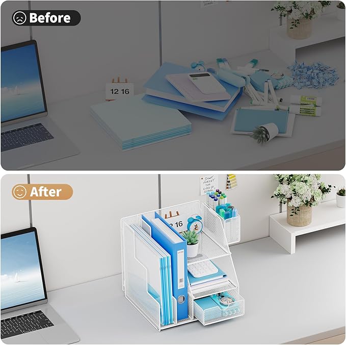 - 【Space Saving】All office document folders would be organized by the vertical file holder. The paper tray organizer is very suitable for storing small books, letters. The desk organizer enough accommodate many office supply accessories, such as pens, pencils, scissors, and so on. Perfect Size: 9.25*9.25*9.37inch