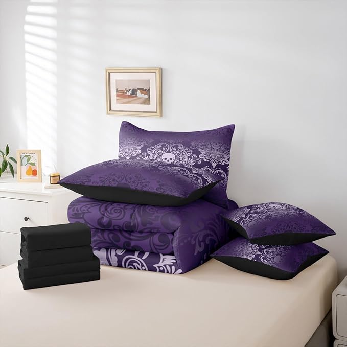 Feelyou Gothic Skull King Comforter Set with Sheets for Kids Boys Girls Damask Print 7 Pieces Bedding Set Goth Bohemian Bed in a Bag Purple Room Decor Soft Lightweight Microfiber