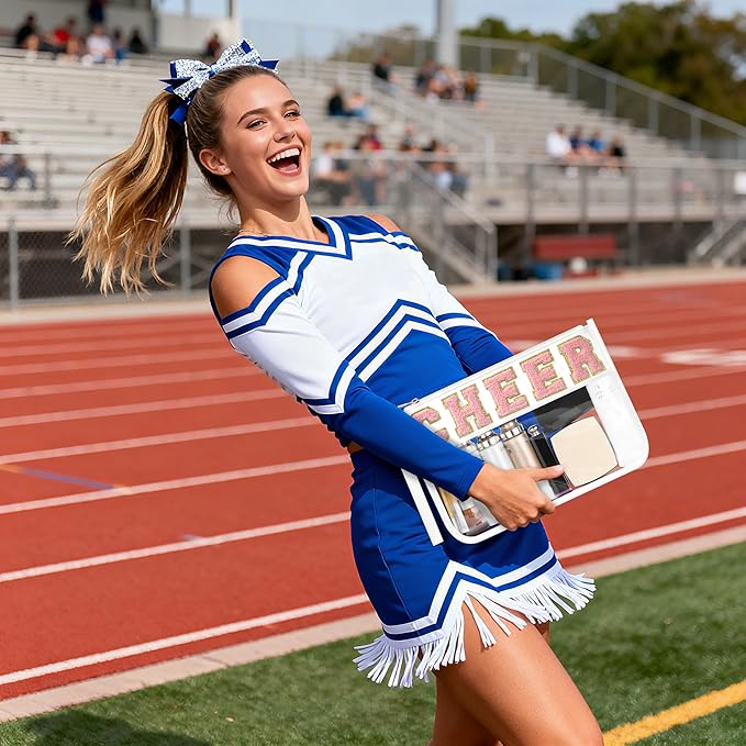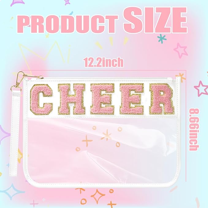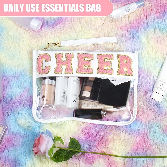 - STYLISH DESIGN: Clear PVC makeup bag featuring varsity-style chenille letter patches with a preppy aesthetic, perfect for cheerleaders and sports enthusiasts