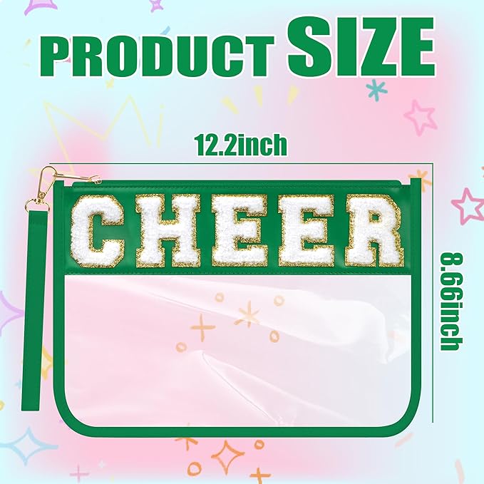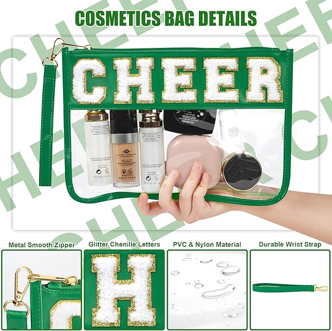 BuyCard Cheer Chenille Letter Bags Clear Makeup Bag, Cheerleader Gifts Cosmetic Bag, Varsity Preppy Patch Flat Pouch Cheer Accessories, Waterproof PVC Organizer Toiletry Bag for Women Girls Green