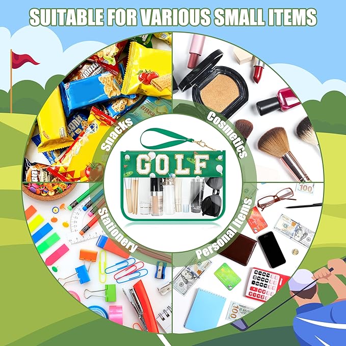 - STYLISH DESIGN: Clear PVC golf makeup bag featuring varsity-style chenille letter patches, perfect for golf enthusiasts with a preppy aesthetic appeal