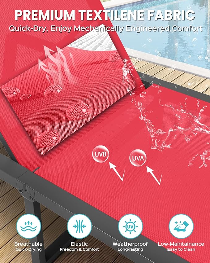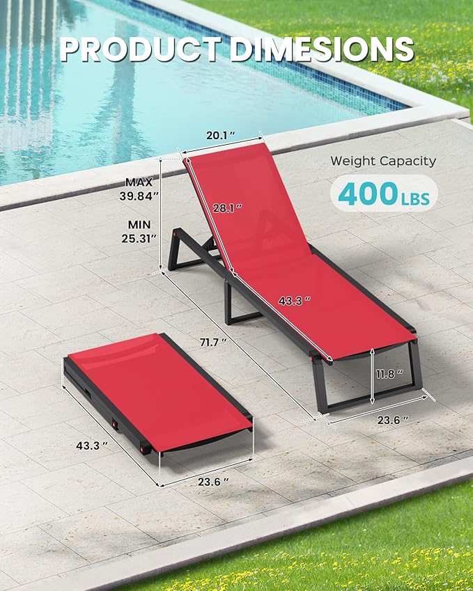- [Durable All-Weather Material] Engineered for durability, this chaise lounge outdoor features a rust-proof aluminum frame and tough textilene mesh, built to resist sun and rain. With a 400 lb weight capacity, this outdoor lounge chair gives long-lasting support