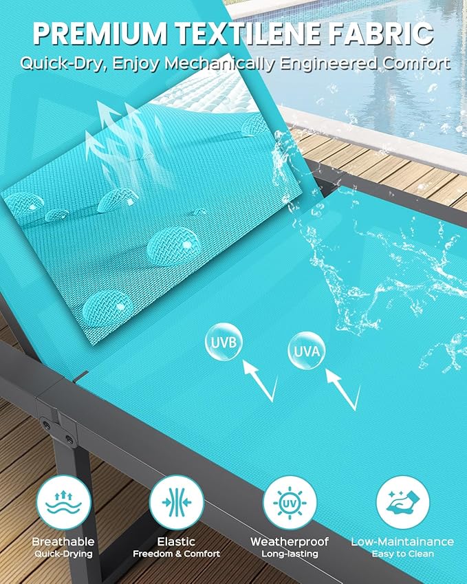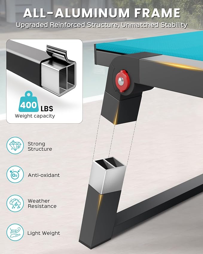 - [Durable All-Weather Material] Engineered for durability, this chaise lounge outdoor features a rust-proof aluminum frame and tough textilene mesh, built to resist sun and rain. With a 400 lb weight capacity, this outdoor lounge chair gives long-lasting support