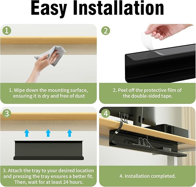 - Note: our Cable Management Tray adheres best to smooth surfaces only. For optimal hold, wait at least 24 hours after installation before loading with cables/power strips.