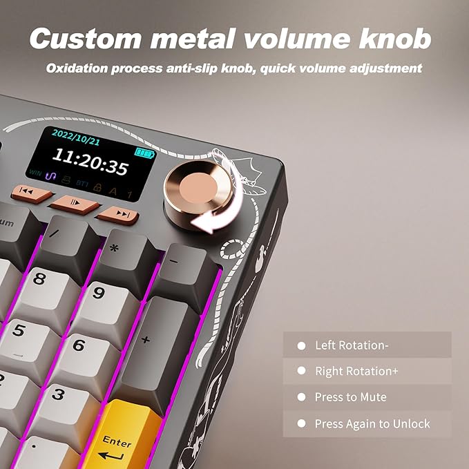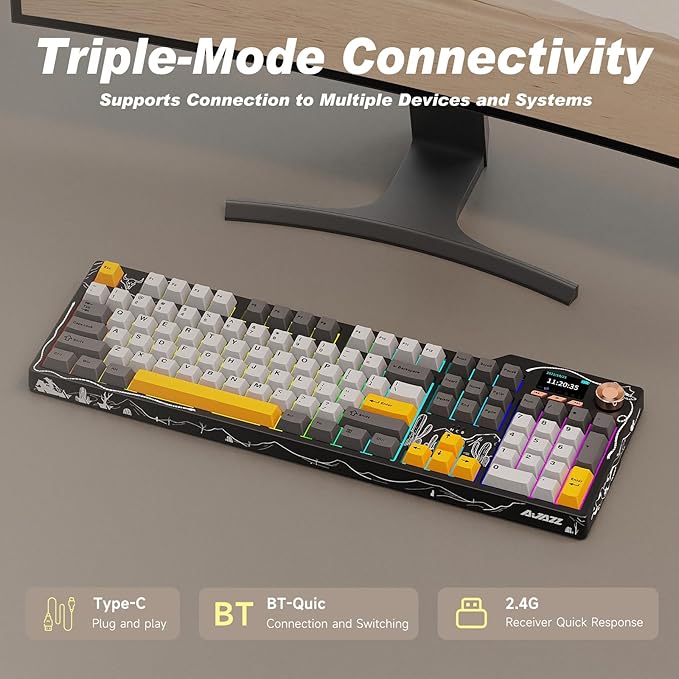 - Smart Color Screen and Multifunction Knob: The stylish AJAZZ AK35I V4 wireless mechanical keyboard is equipped with a smart screen and multifunction knob, leading the new trend. The screen homepage displays various information such as date, time, battery level, system, connection mode, and status indicators. By rotating or pressing the multifunction knob, you can adjust the system, connection mode, volume, RGB lighting modes, language, and screen images/GIFs.