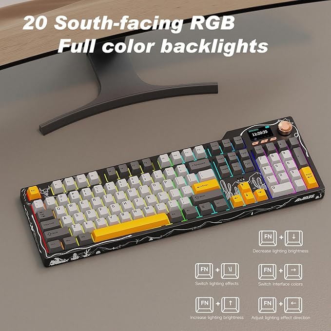 - RGB Backlighting and Programmable Software: This RGB keyboard features 20 lighting effects, 16.8 million RGB colors, and side-illuminated lighting to create an immersive gaming atmosphere. this mechanical gaming keyboard supports full key programming: customize key mappings, macro commands, sleep time, on-screen GIF animations, and RGB lighting effects (including cool music-synced backlighting), perfectly suited for both work and gaming scenarios.