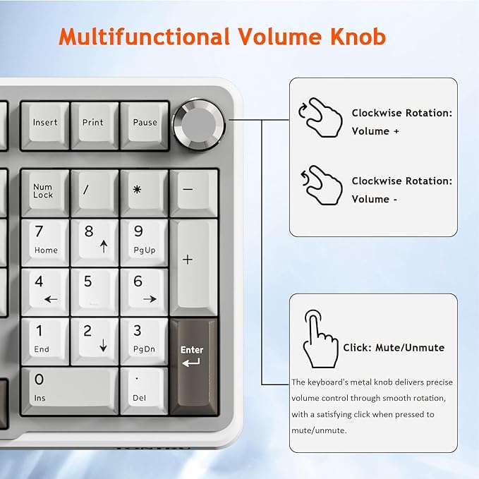 - [Compact Layout & Volume Control] - The compact 101-key design maximizes desk space while retaining full functionality. A dedicated metal rotary knob provides precise volume adjustment and instant mute toggle with a satisfying tactile feel. Enjoy intuitive media control without interrupting your workflow or gameplay.