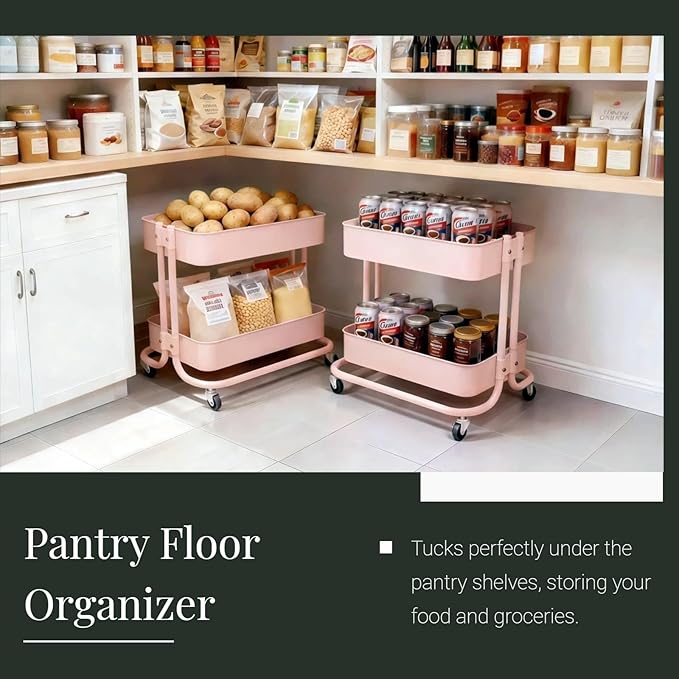 - 【Upgrade Wheels with Smooth Rolling on Carpet】This pink small cart with wheels (including 2 lockable caster) upgraded for effortless 360° movement and stable positioning when needed. The two tier rolling cart rolls smoothly without jamming, even on carpets or uneven surfaces
