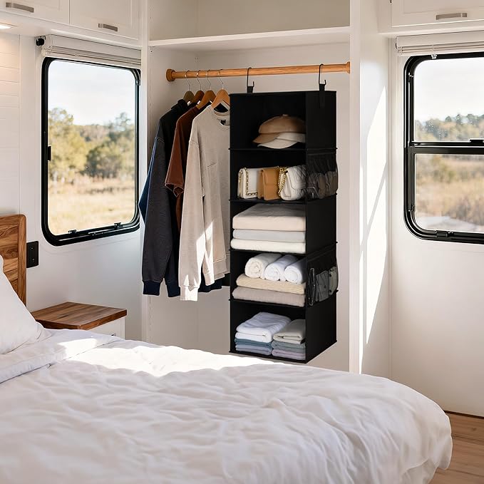 - Versatile hanging clothes organizer for storing sweaters, towels, jeans, pants, t-shirts, handbags, shirts, pants, hats, shoes, and other items in wardrobes, dorms, kids' rooms, trailers, or RVs.
