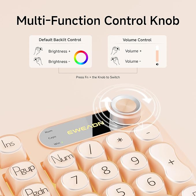 - Dedicated Knob & Display Screen: Equipped with a smart rotary knob, this wired membrane keyboard allows effortless control: toggle between backlight modes with a single press, adjust brightness by rotating the knob, or hold FN + knob to switch to multimedia mode for volume control and mute. The built-in display shows the EWEADN logo and real-time status like Caps Lock, Num Lock, and Win Lock—keeping you informed without any software