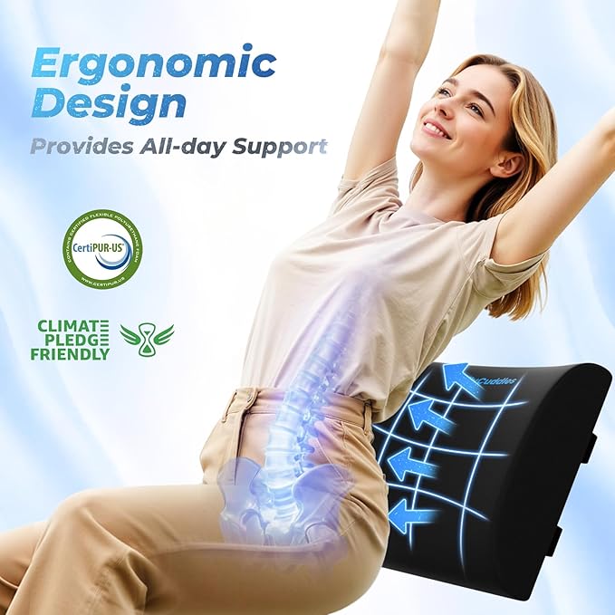 - Ergonomic Design: The DailyCuddles lumbar support pillow for car hugs your waistline and aligns your spine to its "S" shape. The lumbar support for car helps comfort your upper, middle, and lower back during prolonged sitting, bringing all-day pleasure