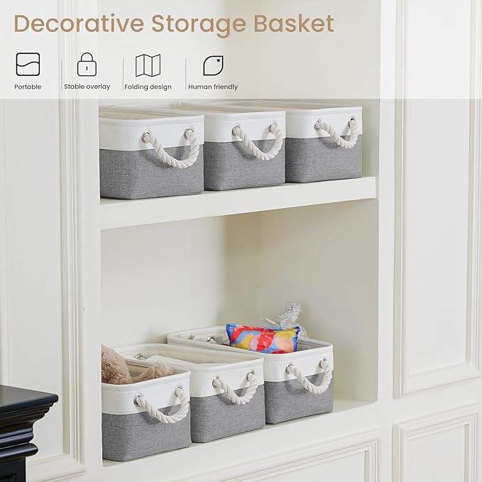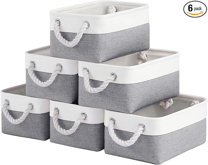 VQRTEXA Storage Baskets for Shelves 11.8x7.9x5.2 Inch, Foldable Fabric Storage Bins with Handles, Small Storage Baskets for Organizing Closet, Bathroom, Office, Home Organization (6-Pack, White&Gray)