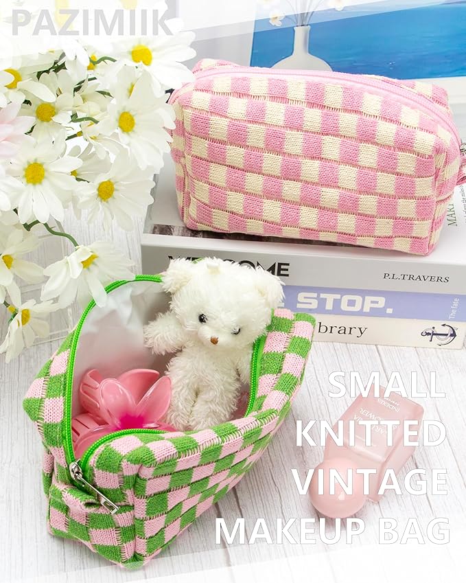 PAZIMIIK 6PCS Checkered Makeup Bag for Purse Portable Zipper Make Up Pouch Small Cosmetic Case for Travel Accessories Pink Green
