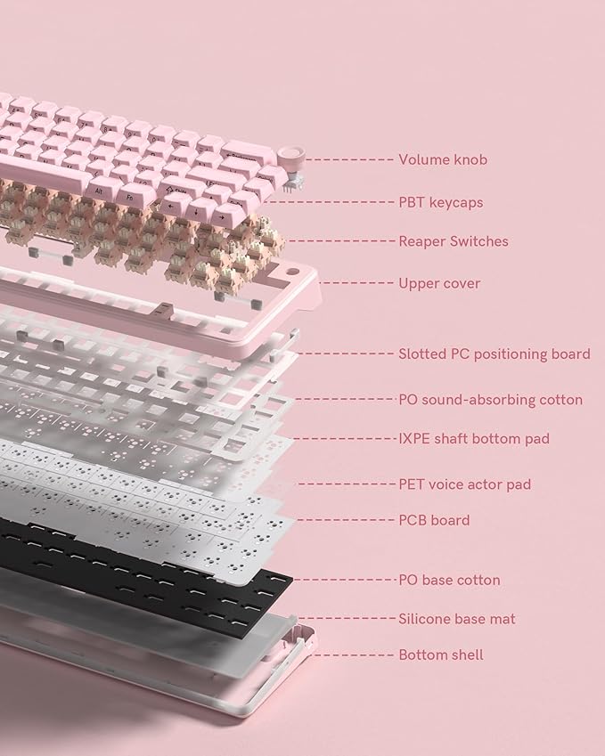 - 【Pro Performance】 This cute pink mechanical keyboard features a multimedia knob and durable jelly keycaps. Five-layer padding creates a creamy typing experience, making this wireless gaming keyboard ideal for both quiet offices and intense gaming sessions. The mechanical keyboard wireless delivers premium performance with fade-resistant legends.