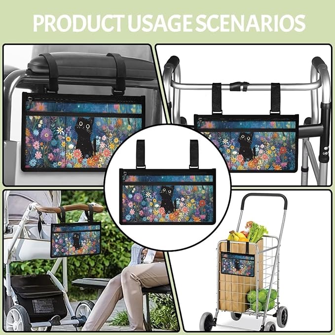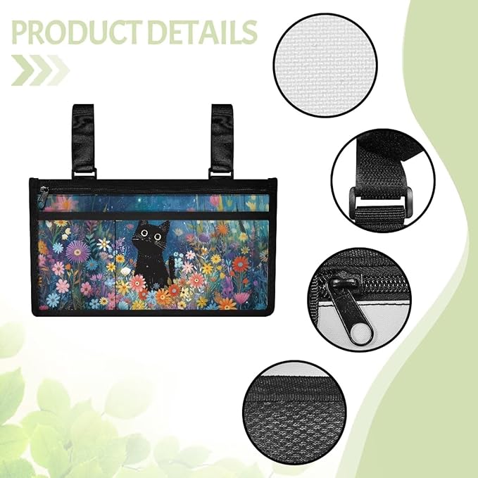 ZOUTAIRONG Black Cat Floral Wolf Wheelchair Side Bag, Wheelchair Armrest Pouch Accessories with Cup Holder, Storage Bag for Walker, Rollator
