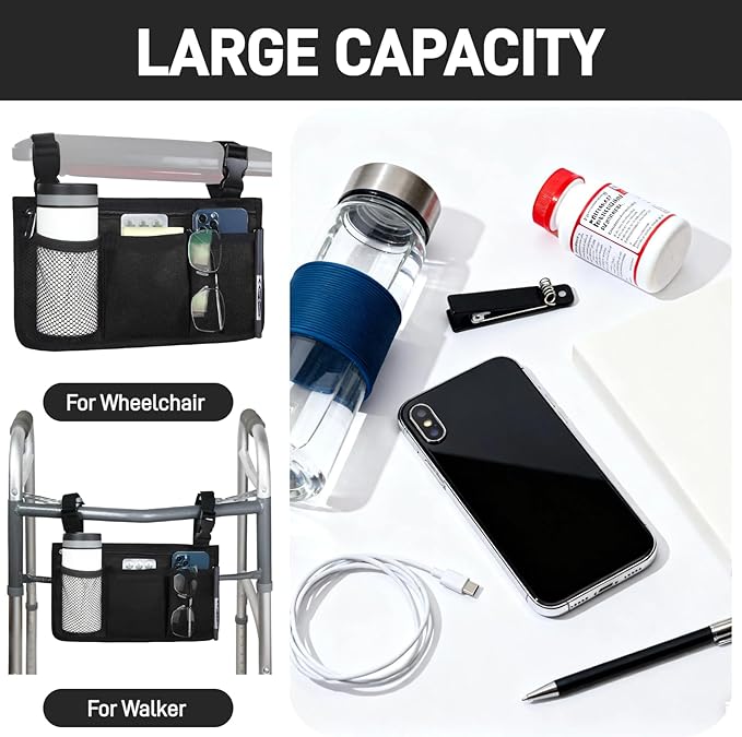 - LIGHTWEIGHT&WATERPROOF: This wheelchair side bag is made of waterproof 600D Oxford fabric. Weighing only 0.15 kg (approximately 0.33 lb), it's lightweight, portable, and easy to clean.