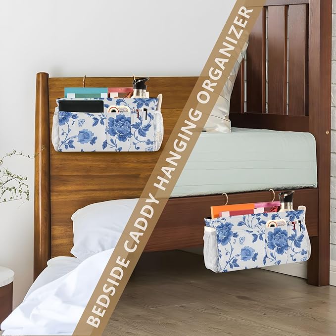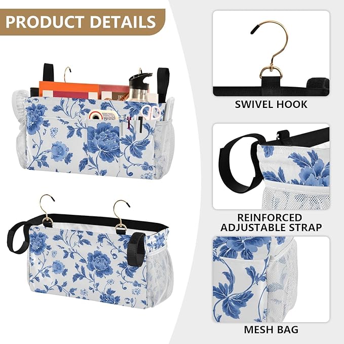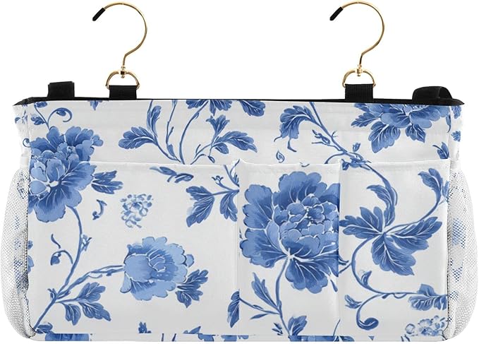 Flowers Blue and White Pattern Bedside Caddy for Dorm Bed Bedside Hanging Caddy Bag Iron Frame Storage Organizer Pocket for Bunk Home College Hospital Beds 2 Hooks