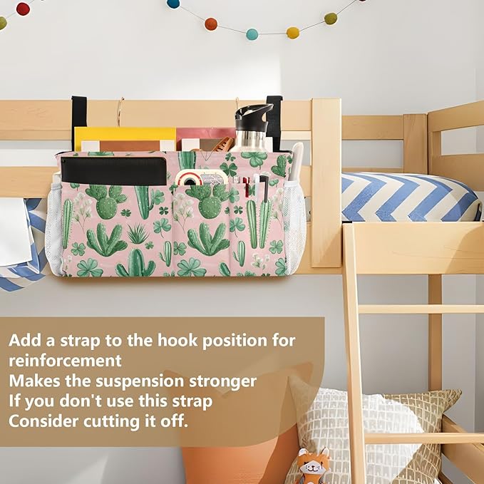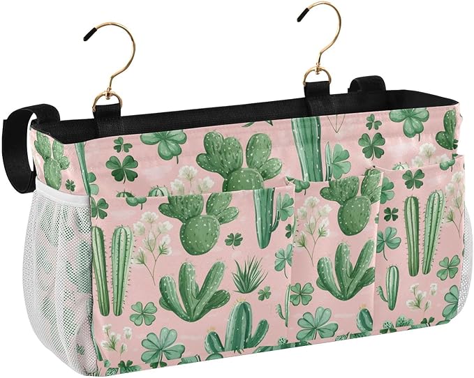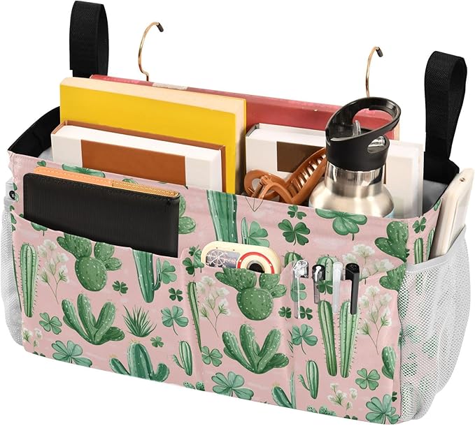 Floral Pink Cacti and Clovers Bedside Caddy for Dorm Bed Bedside Hanging Caddy Bag Iron Frame Storage Organizer Pocket for Bunk Home College Hospital Beds 2 Hooks