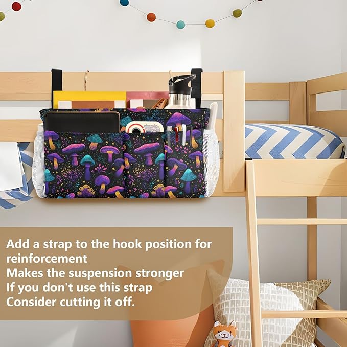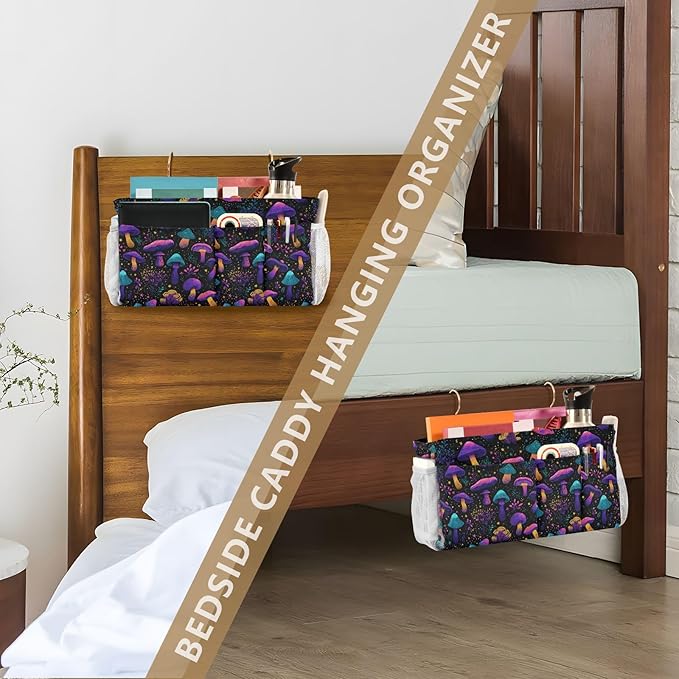 Neon-colored Mushrooms Stars Dots Bedside Caddy for Dorm Bed Bedside Hanging Caddy Bag Iron Frame Storage Organizer Pocket for Bunk Home College Hospital Beds 2 Hooks