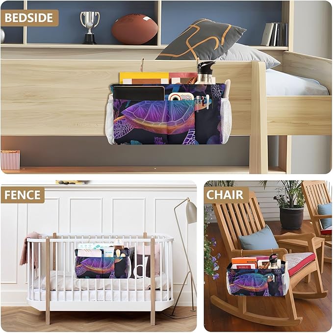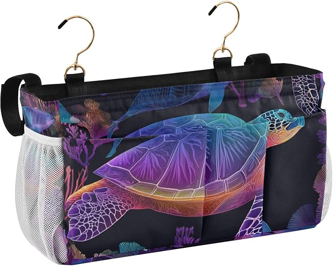 Colorful Gradient Turtle Fish and Coral Bedside Caddy for Dorm Bed Bedside Hanging Caddy Bag Iron Frame Storage Organizer Pocket for Bunk Home College Hospital Beds 2 Hooks