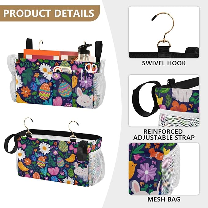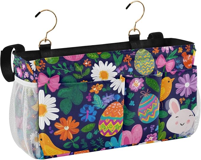Easter Daisy Rabbit Birds Eggs Bedside Caddy for Dorm Bed Bedside Hanging Caddy Bag Iron Frame Storage Organizer Pocket for Bunk Home College Hospital Beds 2 Hooks