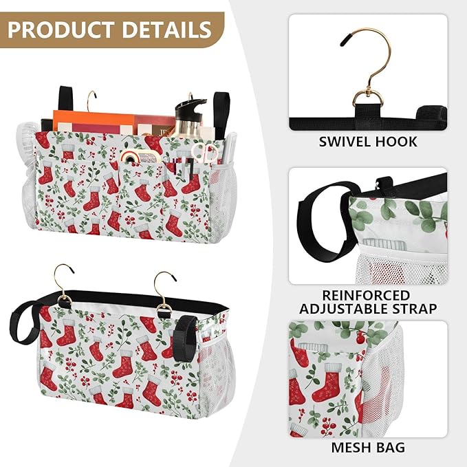 Red Stockings Holly Christmas Bedside Caddy for Dorm Bed Bedside Hanging Caddy Bag Iron Frame Storage Organizer Pocket for Bunk Home College Hospital Beds 2 Hooks